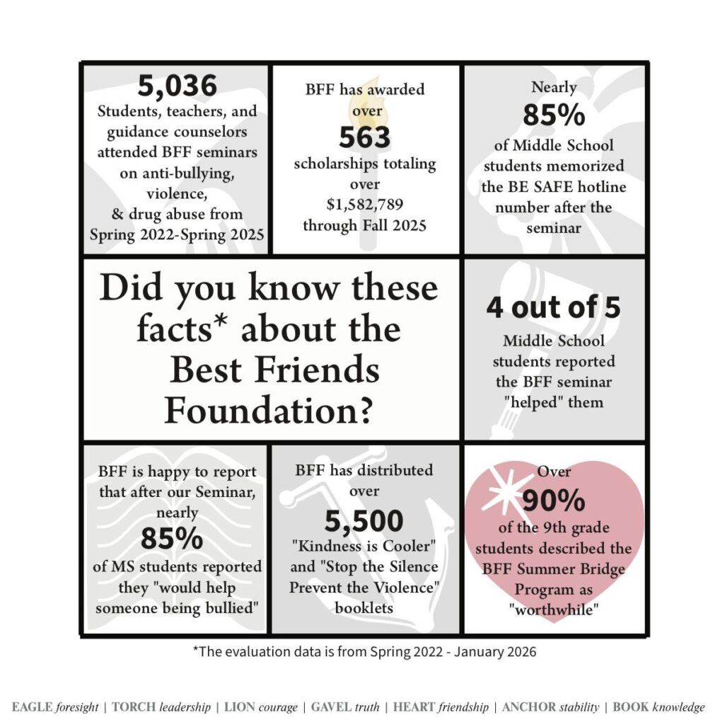 BFF provides scientifically researched, evidence-based, and developmentally sound curriculum beginning with kindergarten through twelfth grade. In the past, thousands of students in over 100 schools in 24 school districts have learned through our program the spirit of true friendship. The Foundation promotes self-respect through the practice of self-control and provides participants the skills, guidance, and support to reject bullying, relationship violence, and drug and alcohol abuse. The Best Friends Foundation provides positive peer groups for adolescents and creates an environment that raises aspirations and promotes achievement. Please Click Here for a snapshot of our success.